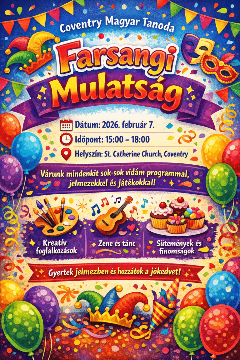 Szeretettel várunk minden tanodás családot és barátot a Coventry Magyar Tanoda Farsangi Mulatságára, ahol vidám, közösségi délutánt tölthetünk együtt jelmezekben, játékokkal és kreatív programokkal!